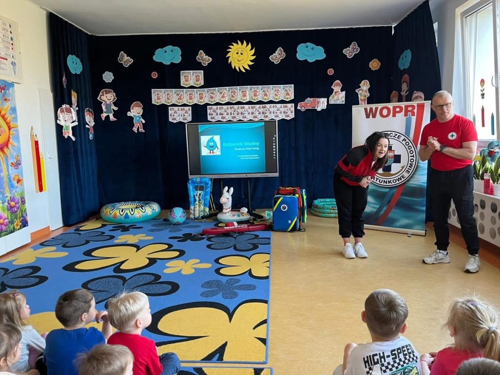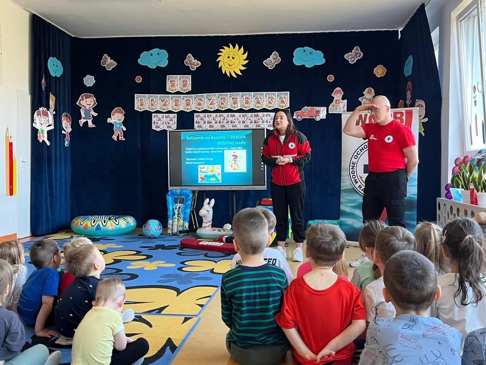 W ramach realizacji innowacji pedagogicznej „Od przedszkolaka do strażaka – droga przez bezpieczeństwo” dzisiaj gościliśmy w naszym przedszkolu wiceprezes WOPR Kielce – panią Natalię Sasal oraz instruktora nauki pływania pana Sylwestra Wróbla.🏊🏻