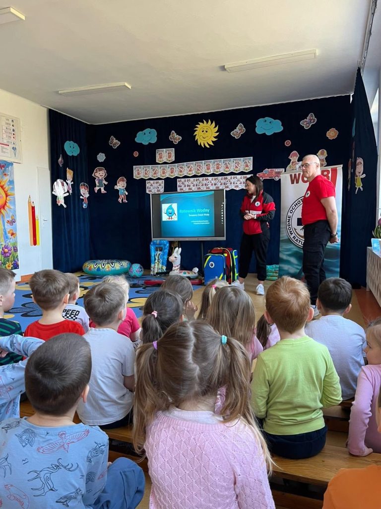Podczas spotkania, przedszkolaki dowiedziały się, na czym polega praca ratownika wodnego oraz jakie obowiązują zasady bezpieczeństwa podczas spędzania czasu na akwenach (baseny, plaże). Dzieci miały też okazję z bliska zobaczyć i poznać elementy wyposażenia ratownika wodnego, które służą do udzielania pomocy. Co wywołało ogromne zainteresowanie wśród przedszkolaków. 😊